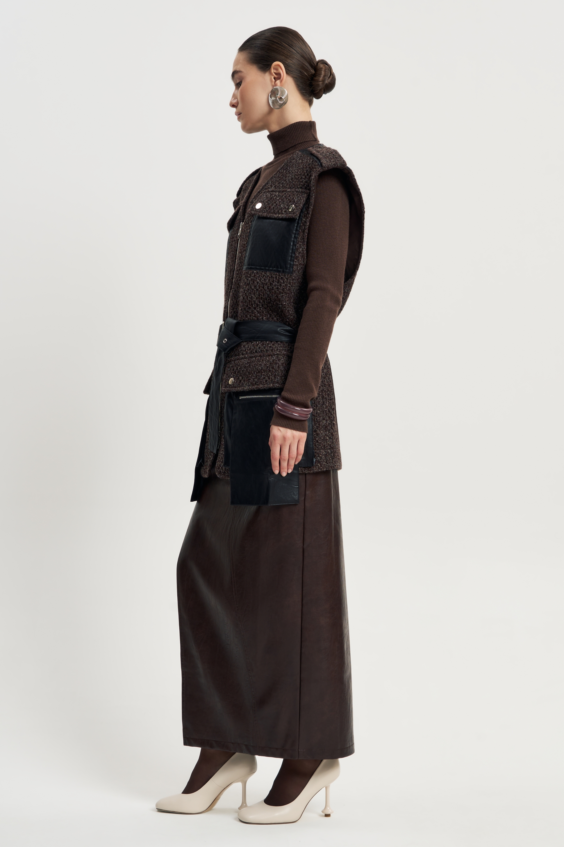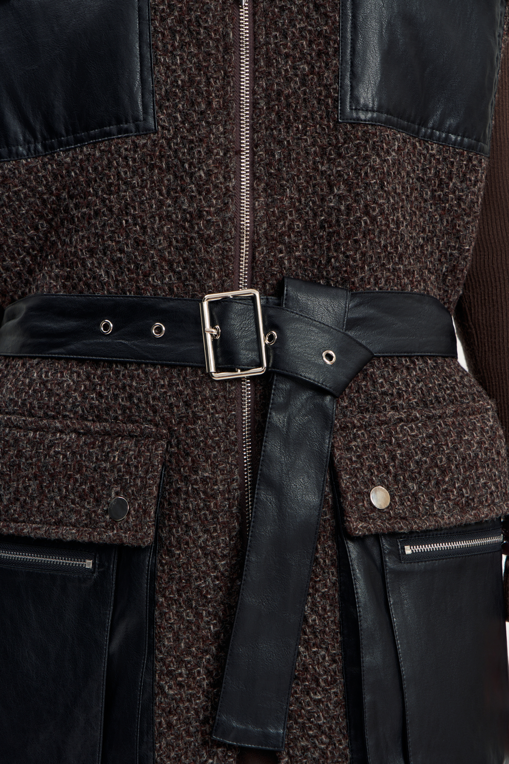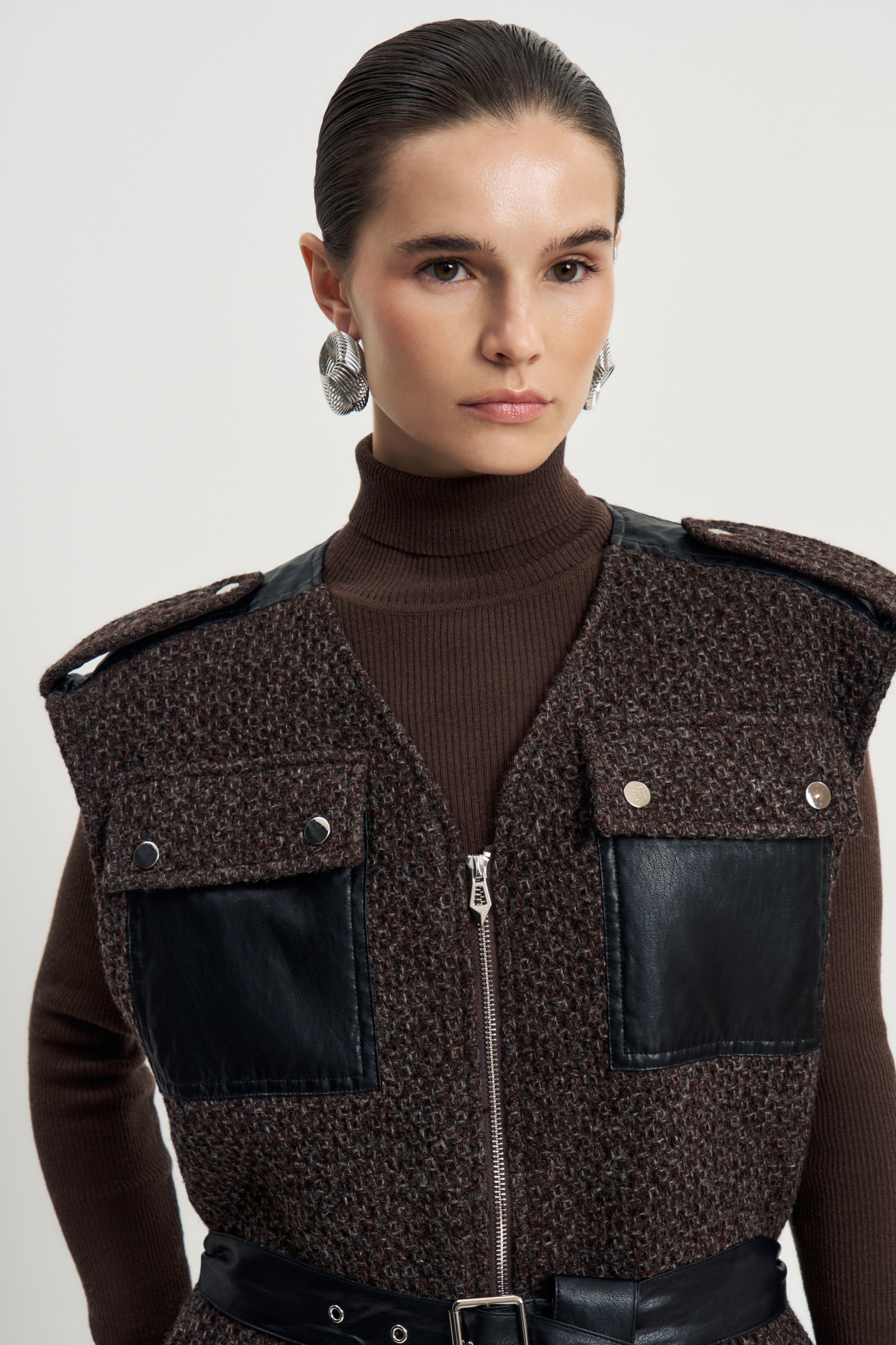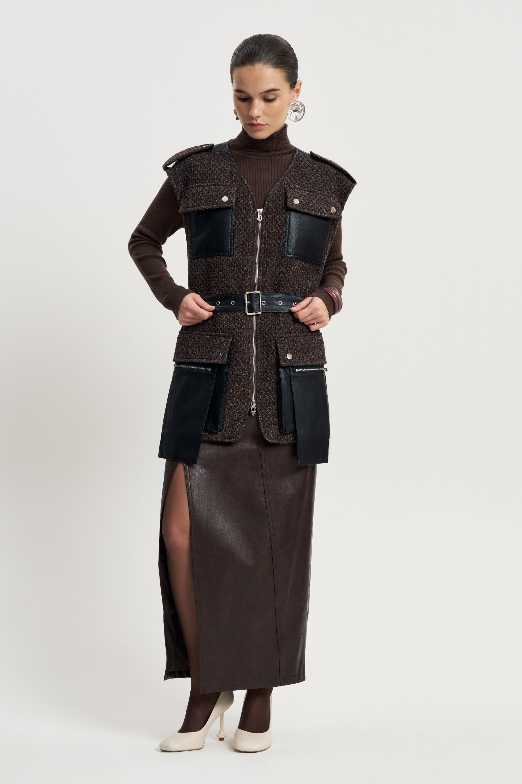 Жесткая фактура коричневой шерсти, чёткий прямой крой, длина до середины бедра. Контрастные кожаные карманы — на груди и по нижнему краю — создают фокус и подчеркивают архитектурность вещи.