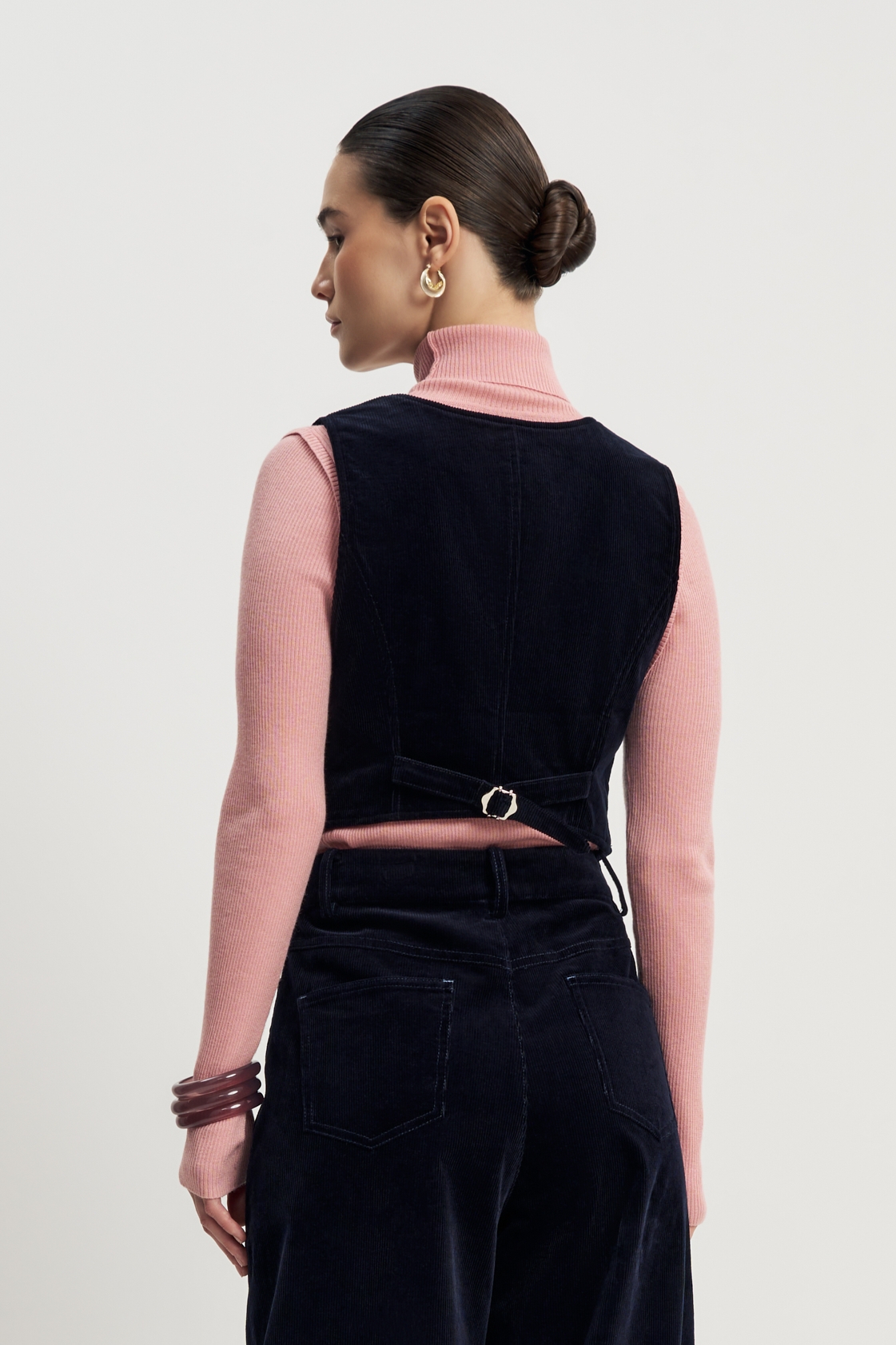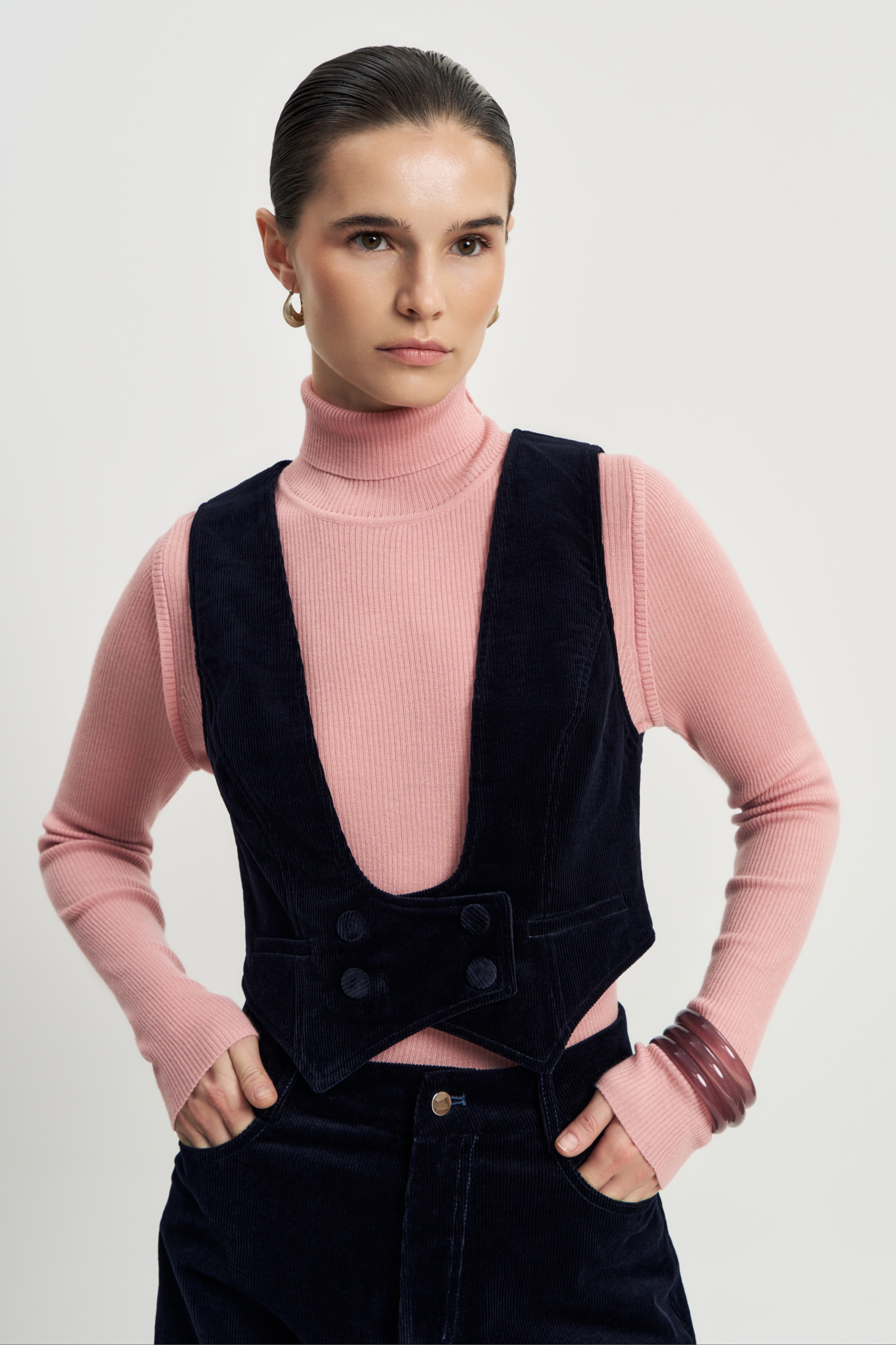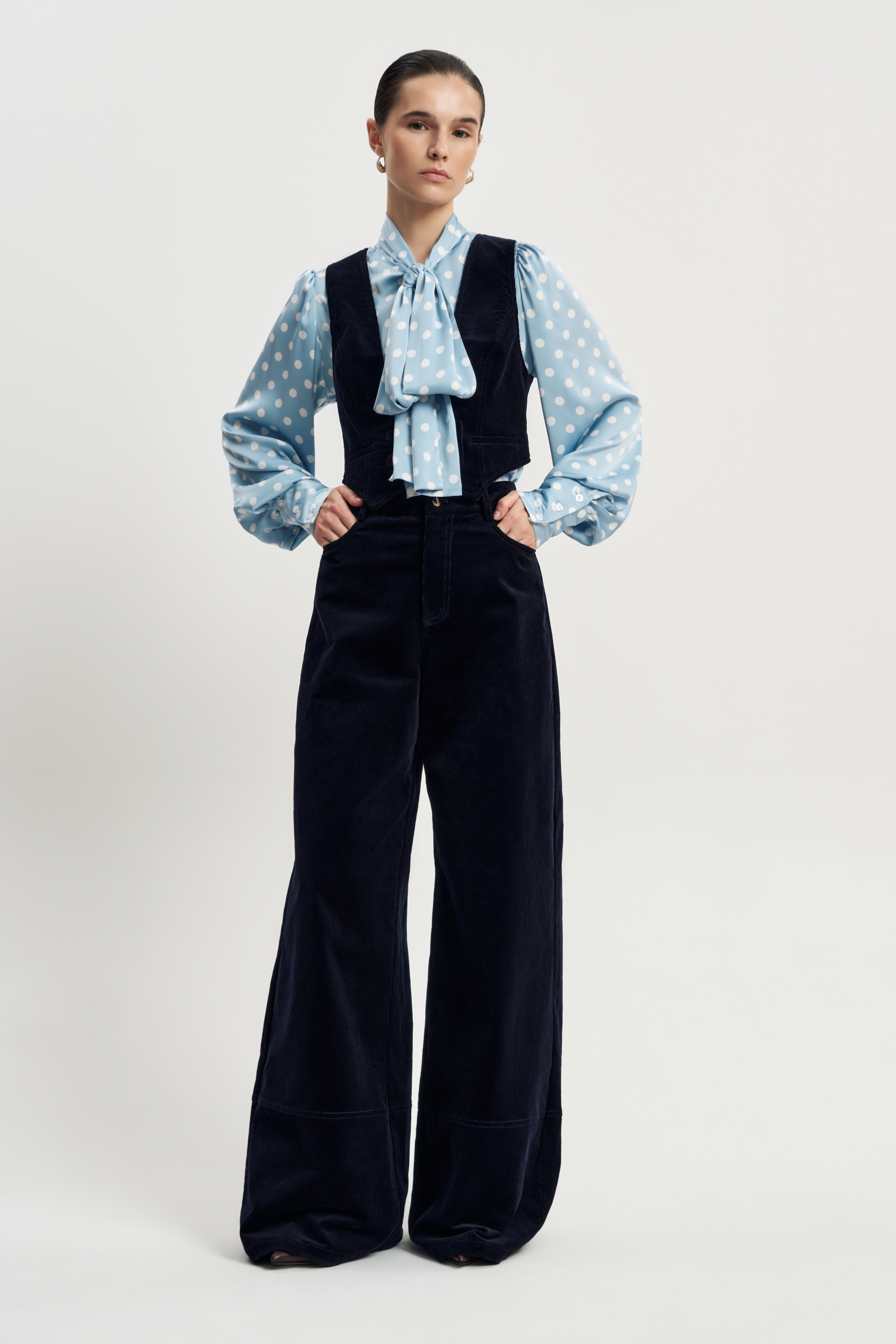 Классический вельветовый жилет — основа элегантного образа. Приталенный силуэт и декольте выгодно подчёркивают фигуру, а глубокий синий оттенок придаёт образу благородство и сдержанный стиль.